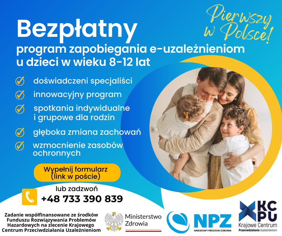 Twoje dziecko nadużywa telefon, komputer, tablet lub inne e-media? Zgłoś się do BEZPŁATNEGO programu profilaktyki e-uzależnień dla rodzin z dziećmi w wieku 8-12 lat, które problemowo używają nowe technologie cyfrowe!